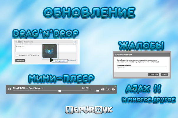 Drag'nDrop — теперь вы можете перетащить и загружать сразу на пост несколько картинок, в страницах загрузки видео или музыки вы также можете загружать сразу несколько файлов
